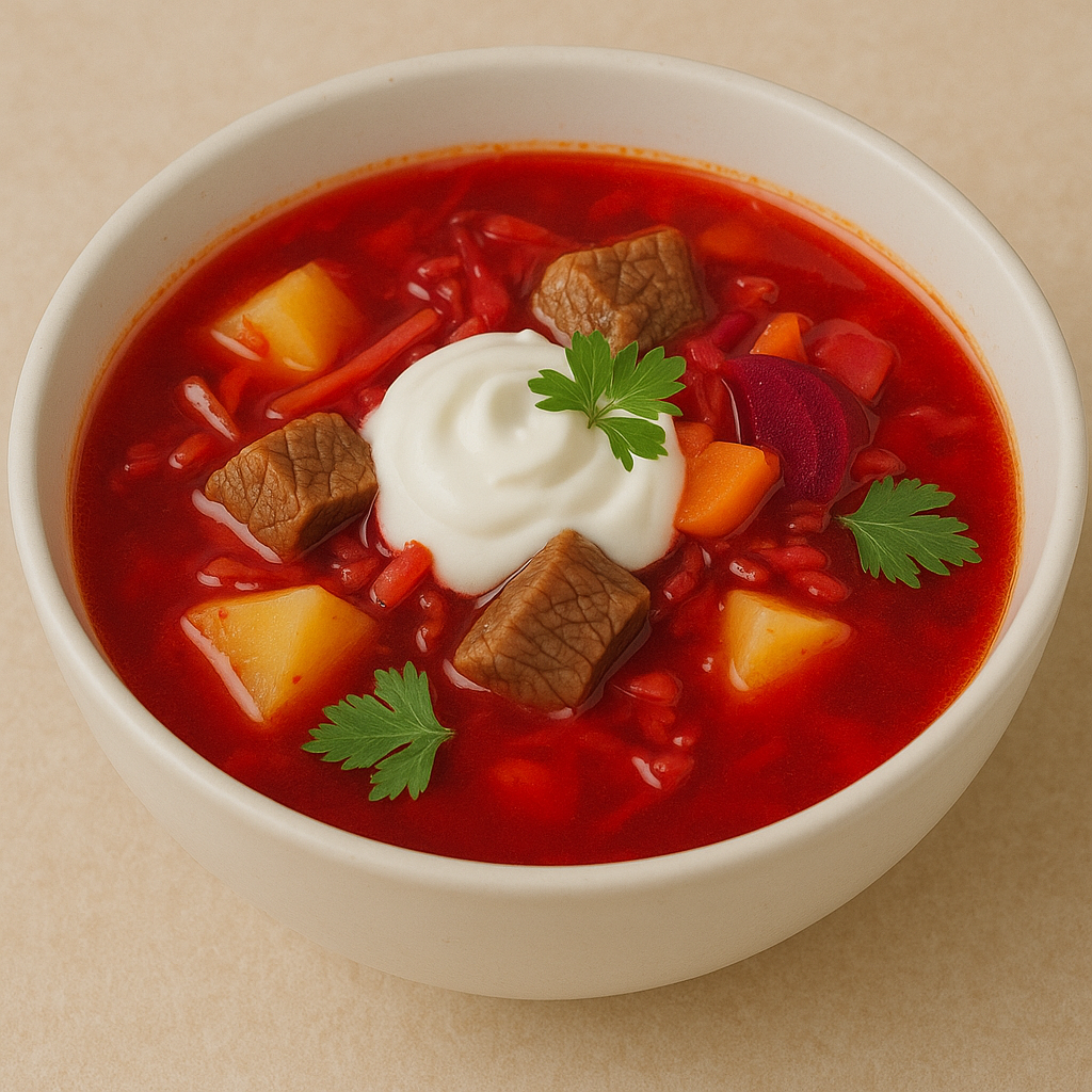 Классический борщ на мясном бульоне со свёклой, капустой и картофелем. Настоящий вкус дома. Минимальный заказ — 1 литр.